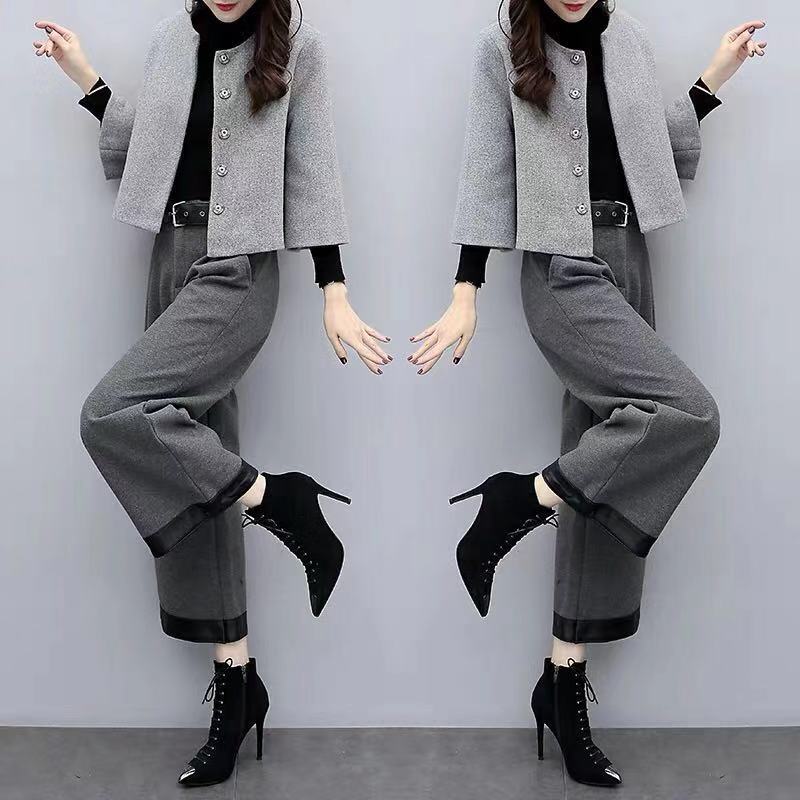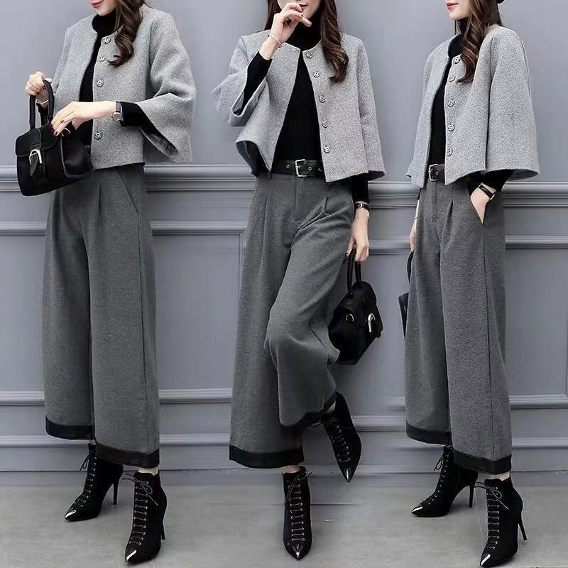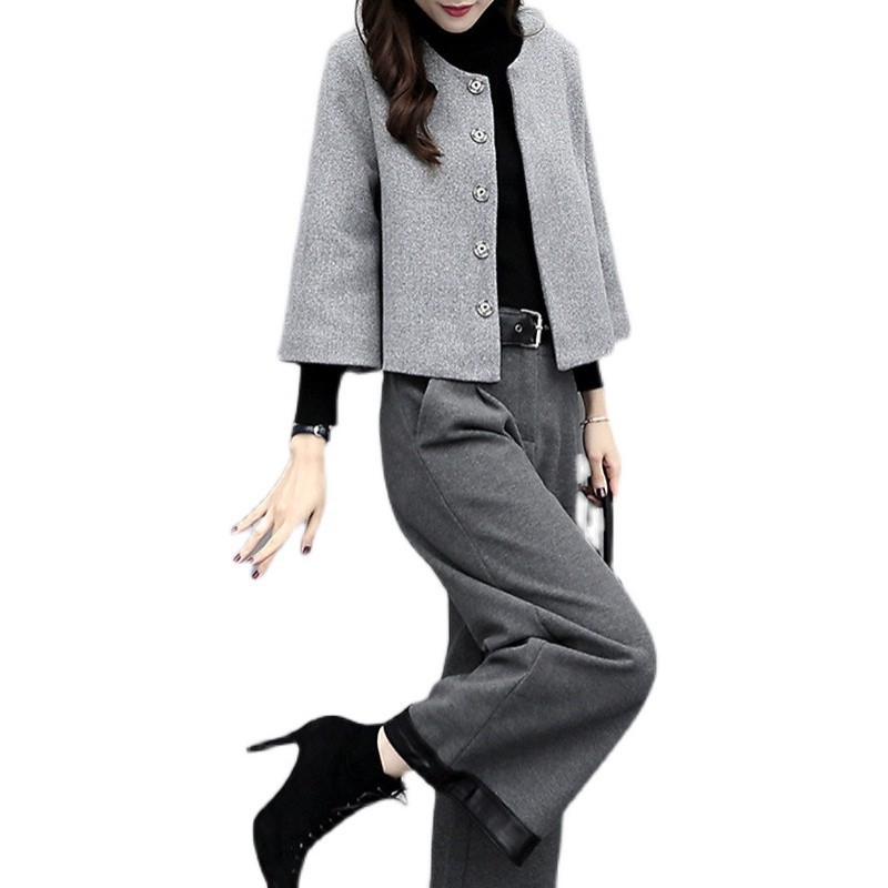 ジャケットは短め丈のデザインで、袖口が広がった女性らしいシルエットが特徴的です。